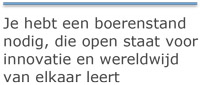 In haar document The future of farming, gebaseerd op een masterclass met 50 vooruitstrevende boeren uit 18 landen over de hele wereld, schetst de Rabobank de uitdagingen waar boeren voor staan om de groeiende wereldbevolking te blijven voeden. Je-hebt-een-boerenstandDat zijn er veel. Maar om de productie te verhogen heb je in ieder geval een deskundige en duurzaam producerende boerenstand nodig, die open staat voor innovatie en wereldwijd van elkaar leert. Een vitale sector dus, niet een die vergrijst.
