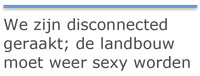 IJntema sprak met de 50 boeren die de Rabobank vanuit de hele wereld invloog voor de bezinningsbijeenkomst over de toekomst van de landbouw. “De boeren geven zelf ook aan: we zijn disconnected geraakt.” Om het tij te keren moet landbouw weer sexy worden, zegt We-zijn-disconnectedhij. En hij ziet een kentering die dat mogelijk maakt; de prijs van voedsel gaat omhoog. “Een paar jaar geleden hebben we een omslagpunt gehad. Wereldwijd is er nu meer vraag dan aanbod. En de vraag naar voedsel blijft groot. Dat betekent hogere prijzen. Er ligt in theorie dus een goeie toekomst voor de boer.”