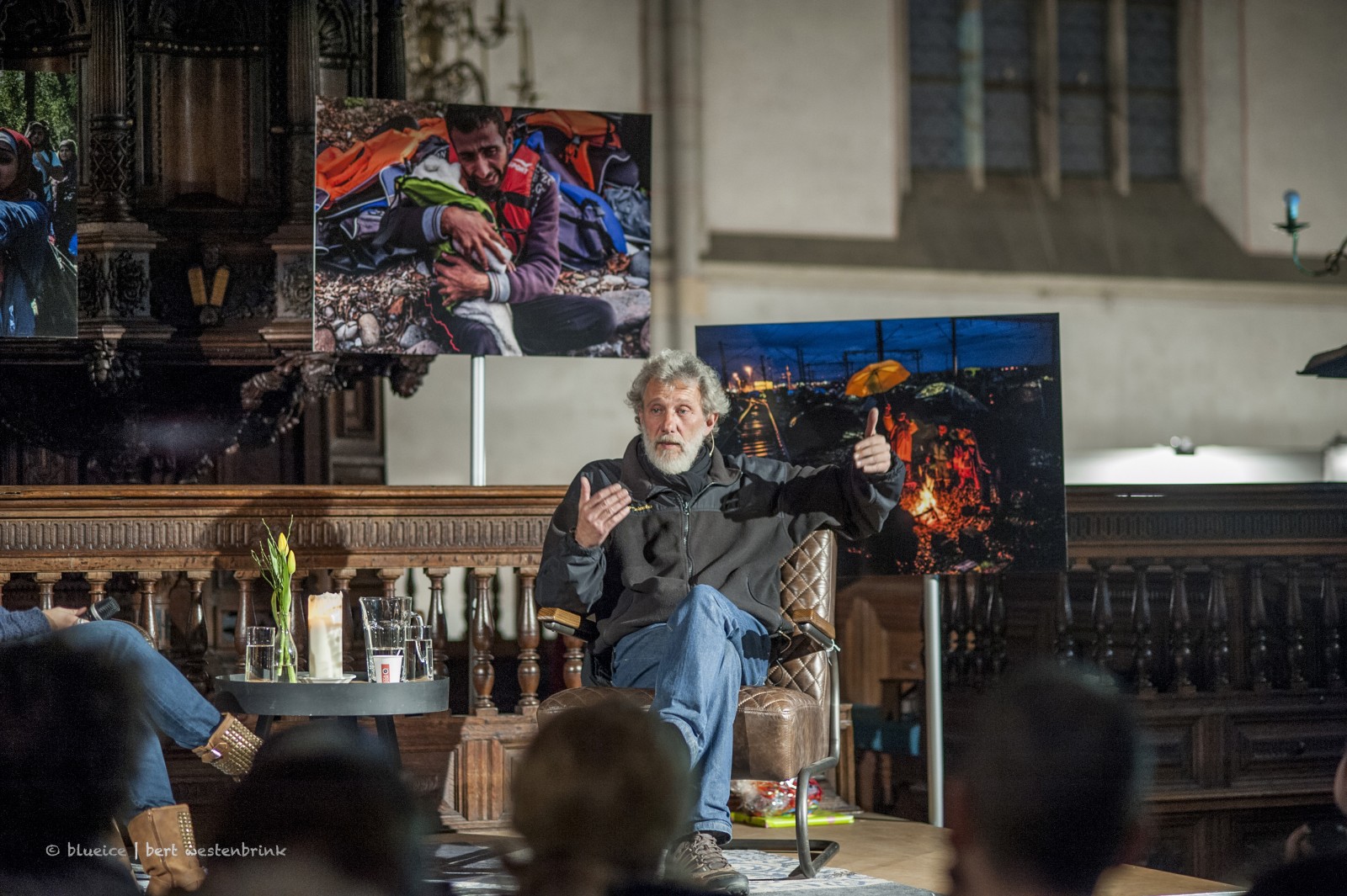 Hij deed dat aan de hand van foto’s, deels in de vorm van aan reportage over een groep vluchtelingen die hij dagenlang op de voet volgde tijdens hun barre tocht naar de grens met Macedonië. Hij maakte deel uit van de groep, overnachtte met de vluchtelingen, stak rivieren over, reisde met ze in een overvolle trein, werd gearresteerd en legde dat alles vast in een reeks indringende foto’s over erbarmelijke omstandigheden, zoals gezinnen die overnachten in tenten die in water staan.