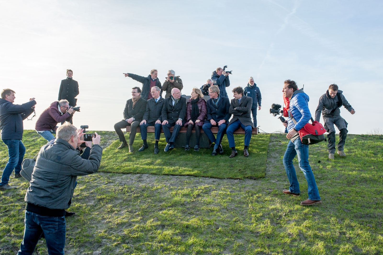 In Delfzijl is de versterkte zeedijk ‘veilig verklaard’ door minister Cora van Nieuwenhuizen. Na haar toespraak nam de bewindsvrouw met bestuurders van waterschap, gemeente, provincie en aannemer de eerste van drie zogeheten gedichtenbanken op de dijk in gebruik.